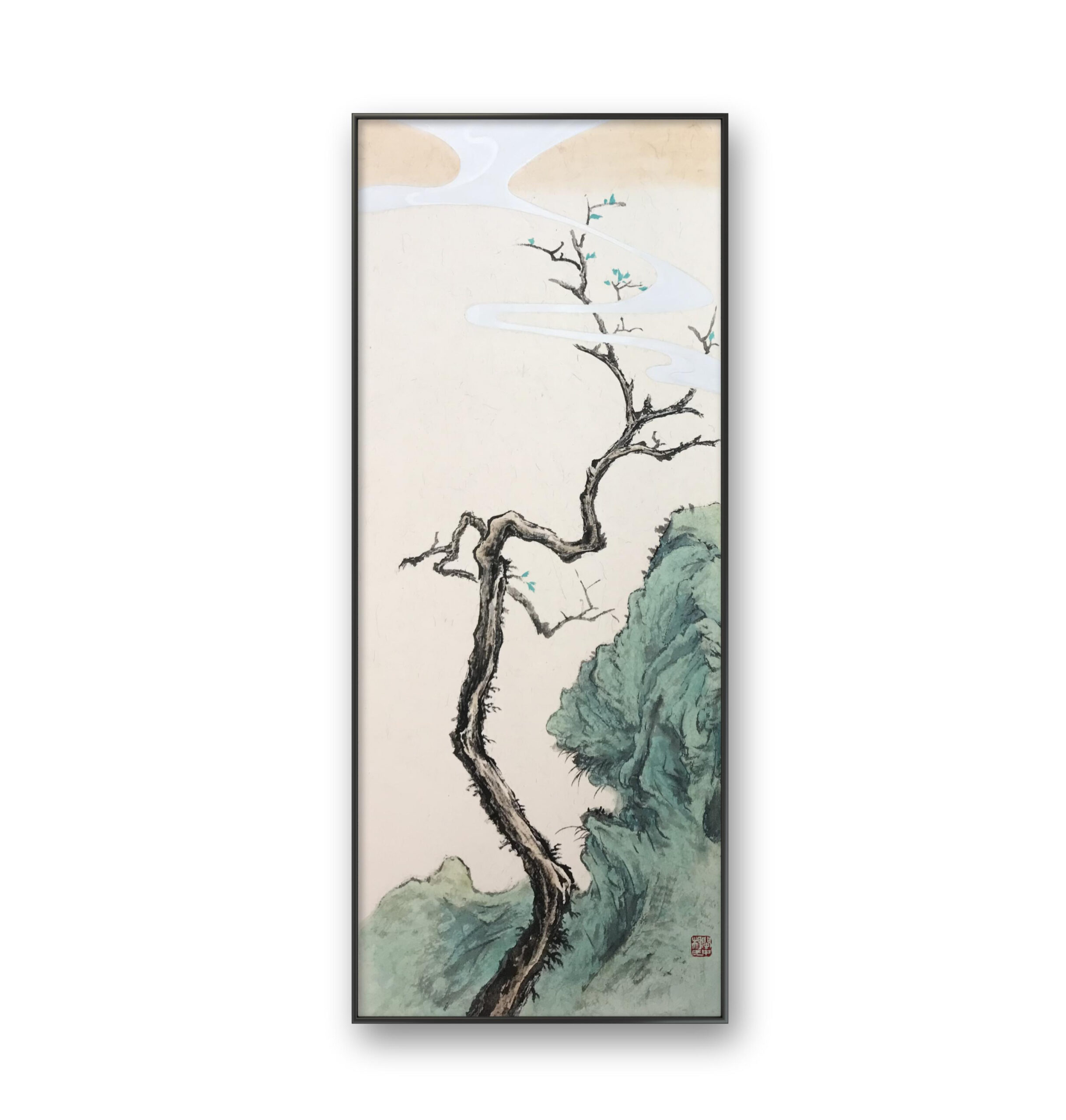 But life never truly ends. On its seemingly withered branches, I touched in a few new buds with the brightest mineral blue-green. This vivid color is a messenger from spring, a promise of renewal. It contrasts with the tree’s age yet creates a perfect harmony—the classic Eastern image of “a withered tree meets spring.” In the deepest silence, life is always brewing.