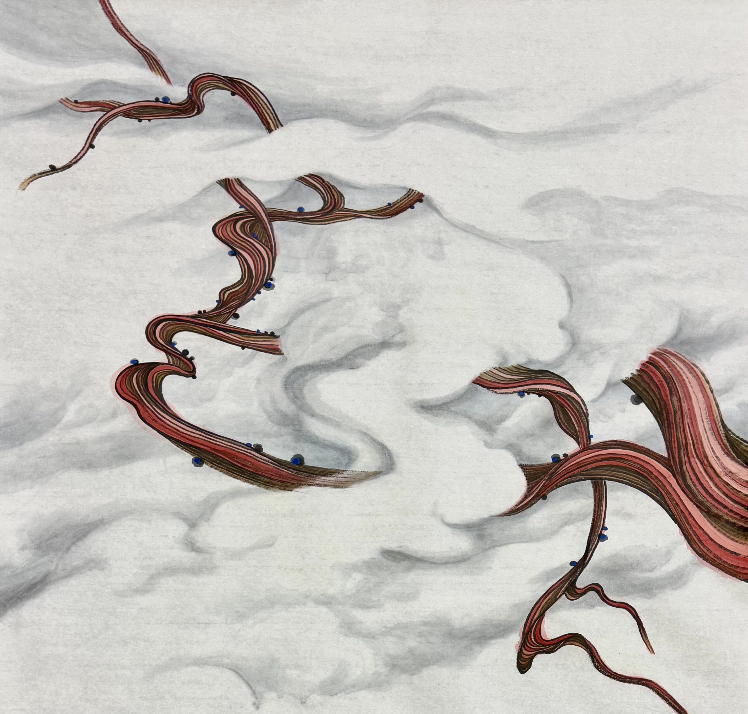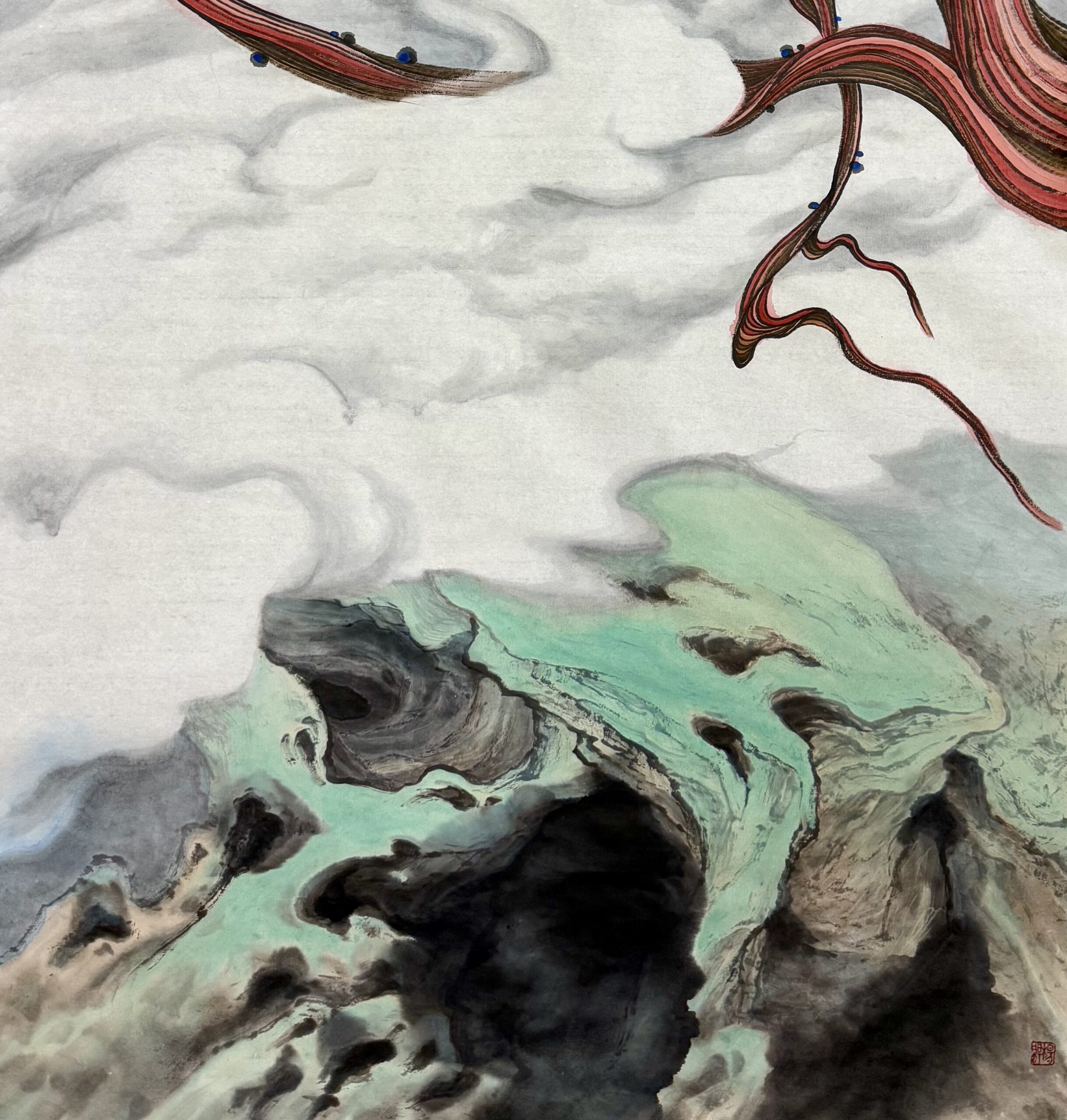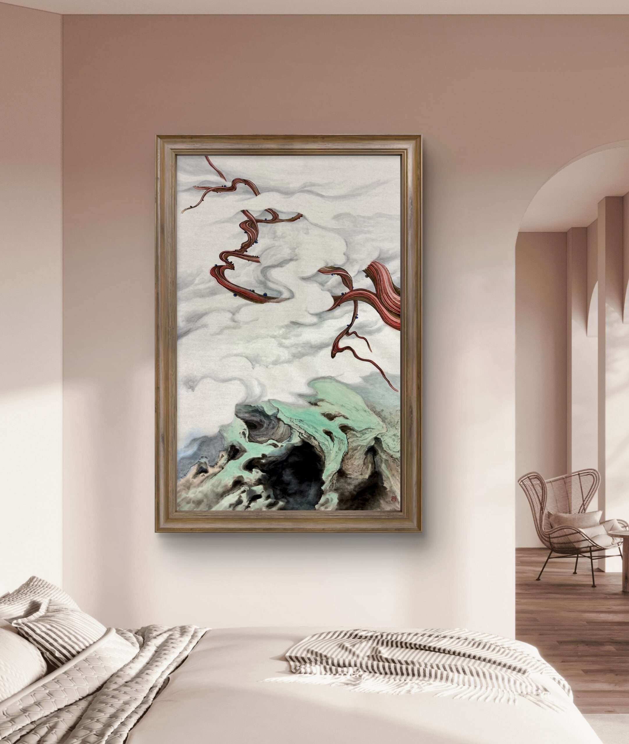 Using classical ink wash techniques on fragmented, isolated mountain forms, I explore the nature of modern experience. Each color represents a different emotional state: tranquil blues, vibrant turquoises, nostalgic ochres, and a surreal touch of pink for dreams or fantasy. The negative space between them is not empty, but a silent void that invites the viewer to actively connect these fragments and create their own narrative.