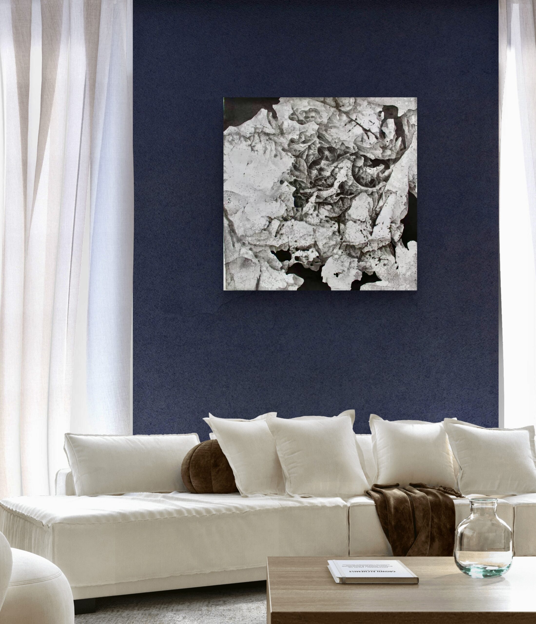 This piece is a powerful statement for collectors seeking Monochrome and Abstract Ink Art. Its vertical format (26.65*26.65 in) makes it an ideal centerpiece. The work ships safely in a Tube.