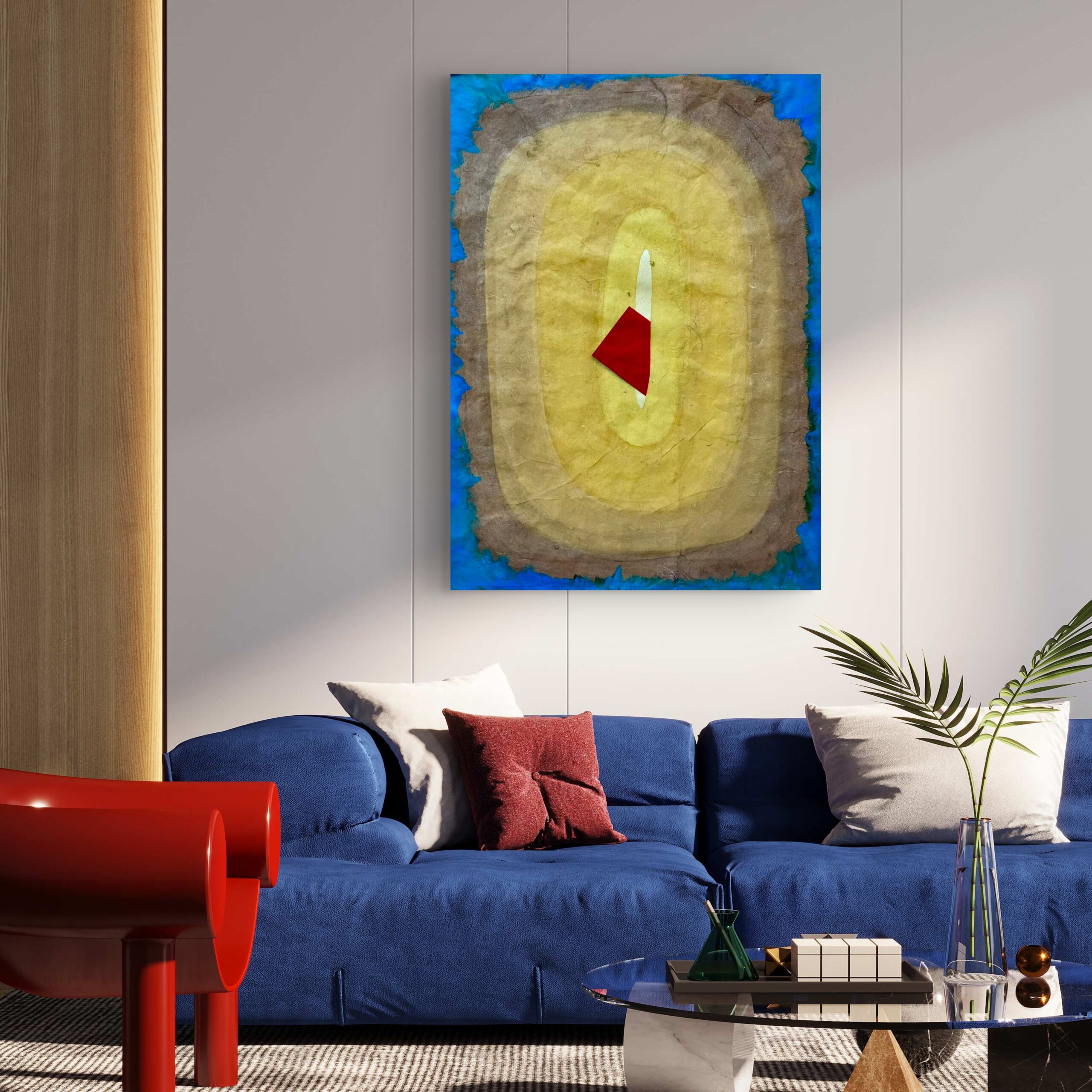 Executed in watercolor on textured hemp paper (Ma Zhi), the medium itself contributes to the work’s unique aesthetic. The rough, fibrous texture of the paper provides a tactile contrast to the smooth, controlled application of the central red element. The concentric yellow and brown rings create a meditative, almost spiritual aura, drawing the viewer’s eye inward to the core of the symbol. The surrounding blue border provides a final, striking contrast.