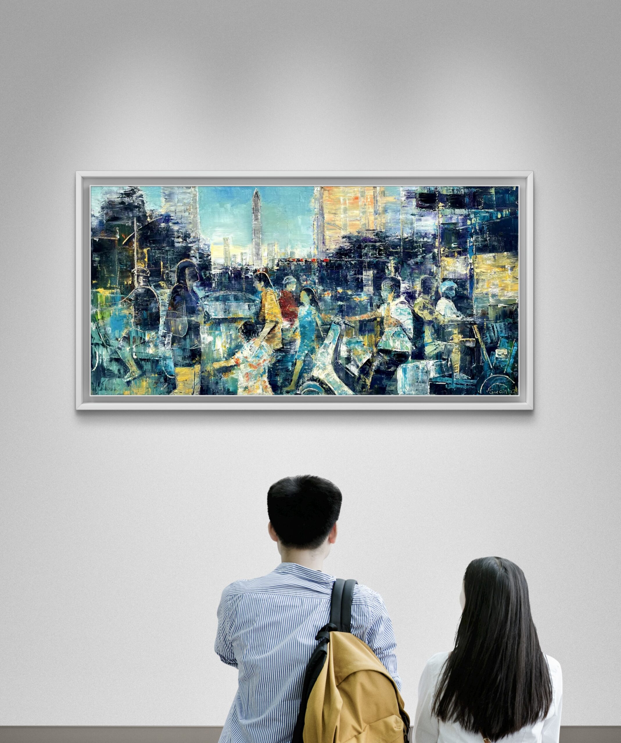 What is a city? A forest of steel, or this ever-surging tide of people? My palette knife seeks to capture this life force. I don’t detail faces; in the city, we are all blurred silhouettes swept along by the torrent of our times. I use thick oil paint and decisive scrapes to knead figures and background together, their outlines dissolving into the mottled urban light.