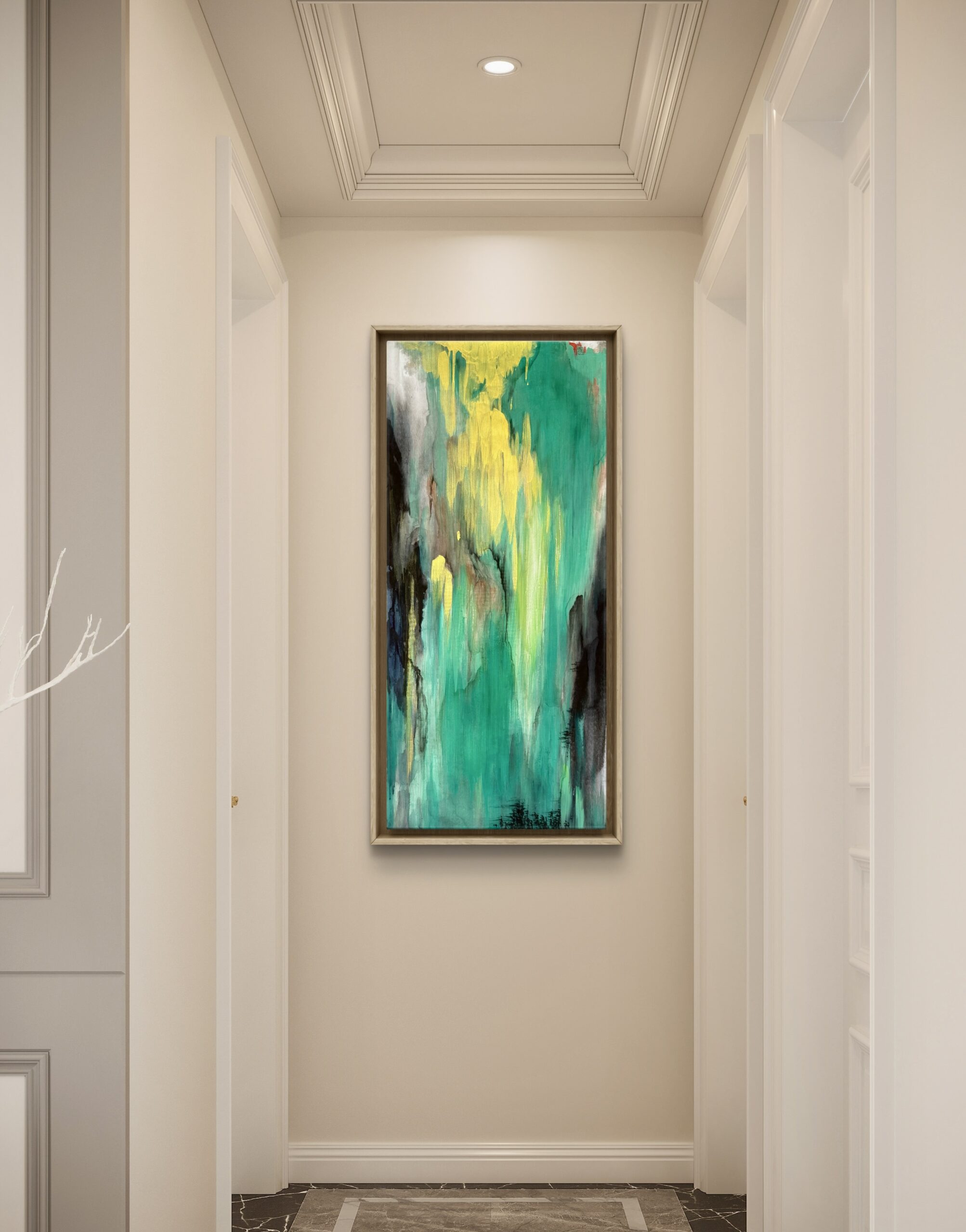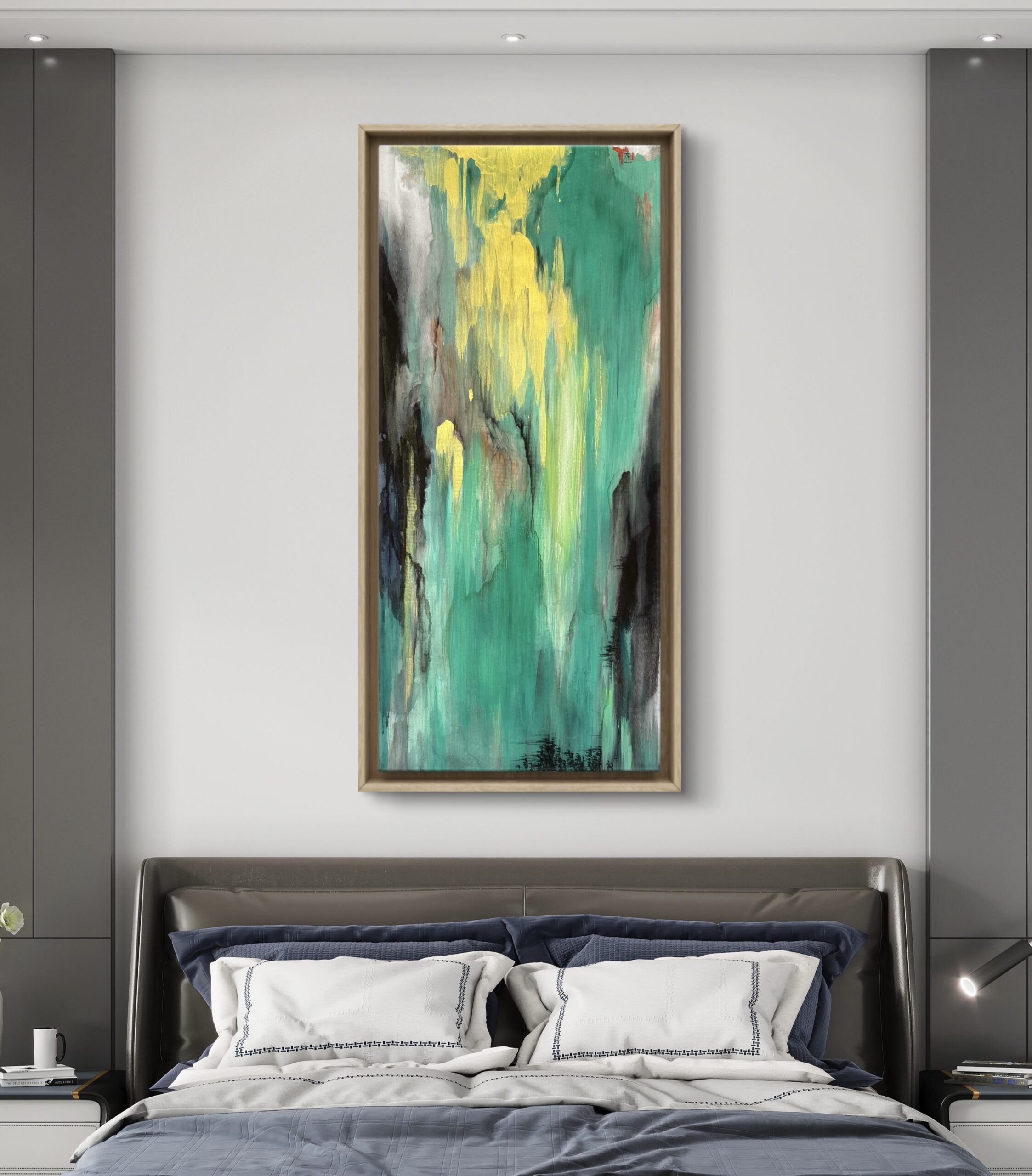 Vibrant Emerald Green flows vertically, evoking an untamed waterfall and life force. This dynamism is anchored by deep, silent Black Ink masses, symbolizing ancient, enduring cliffs—a nod to classical Shanshui structure. The focal point is the incandescent Metallic Gold element, a spiritual beacon symbolizing Hope, Enlightenment, and Qi. It acts as an internal light source piercing the depth.