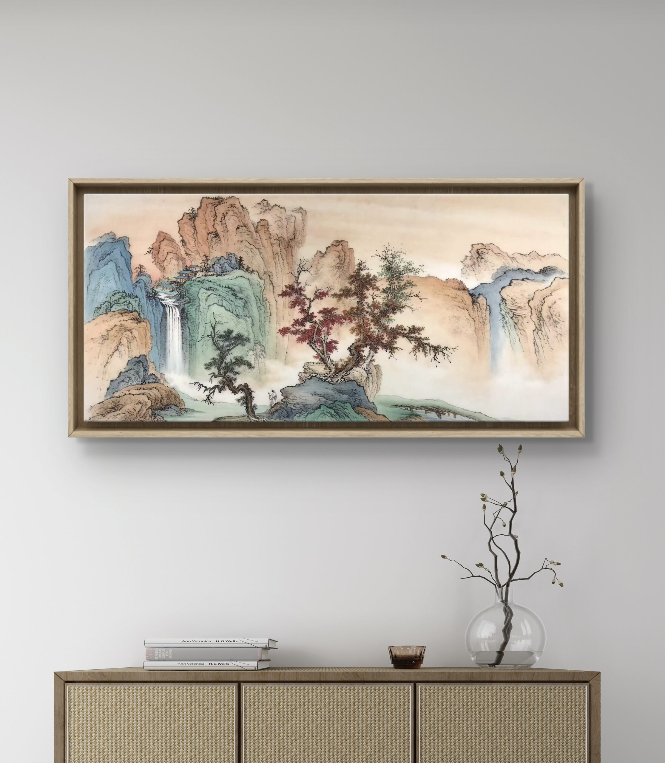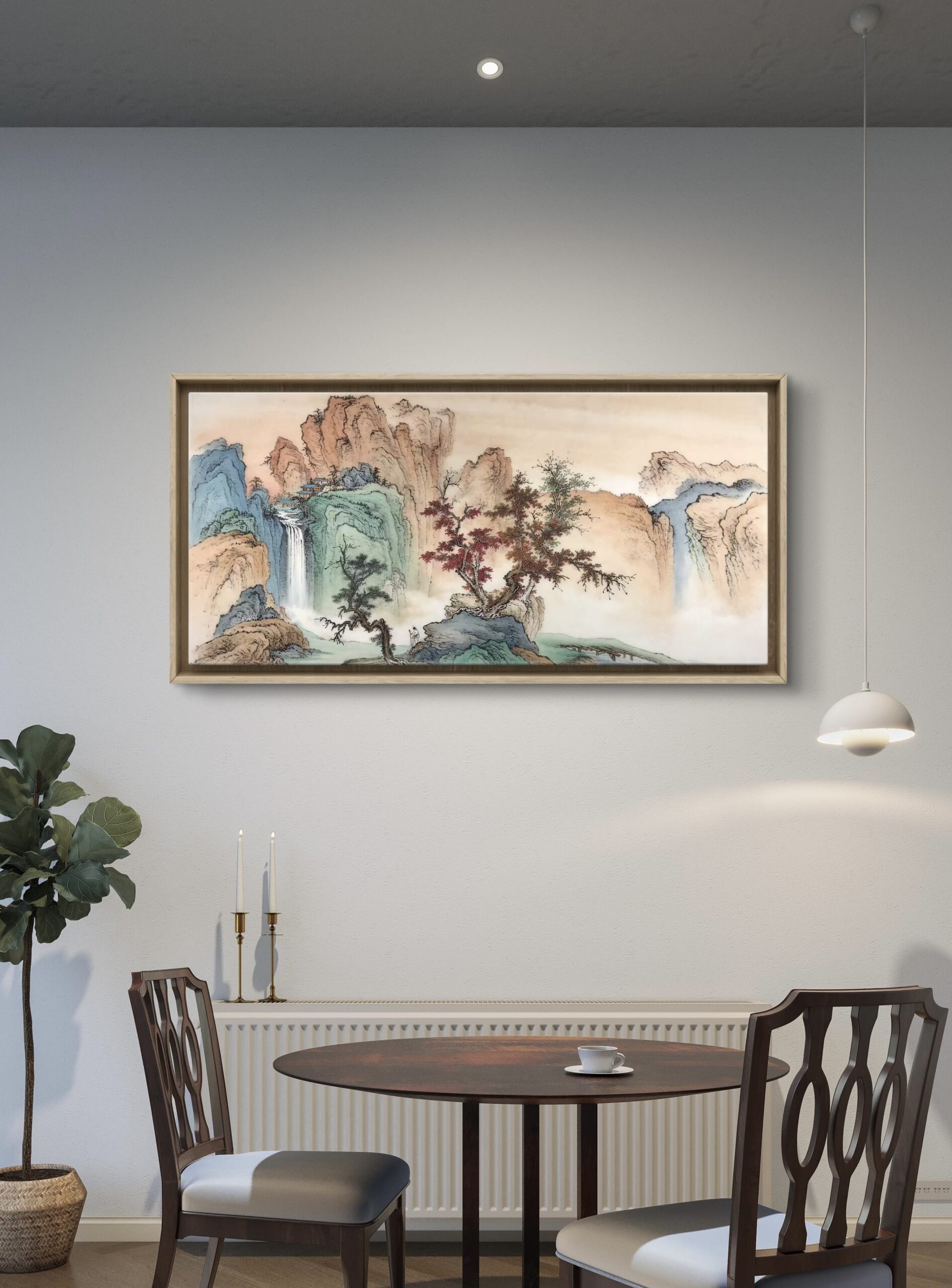 #ink wash painting #chinese ink painting #ideal landscape #spiritual sanctuary #ochre and cyan #poetic and warm #habitable mountain #dreamscape painting #red tree symbolism
