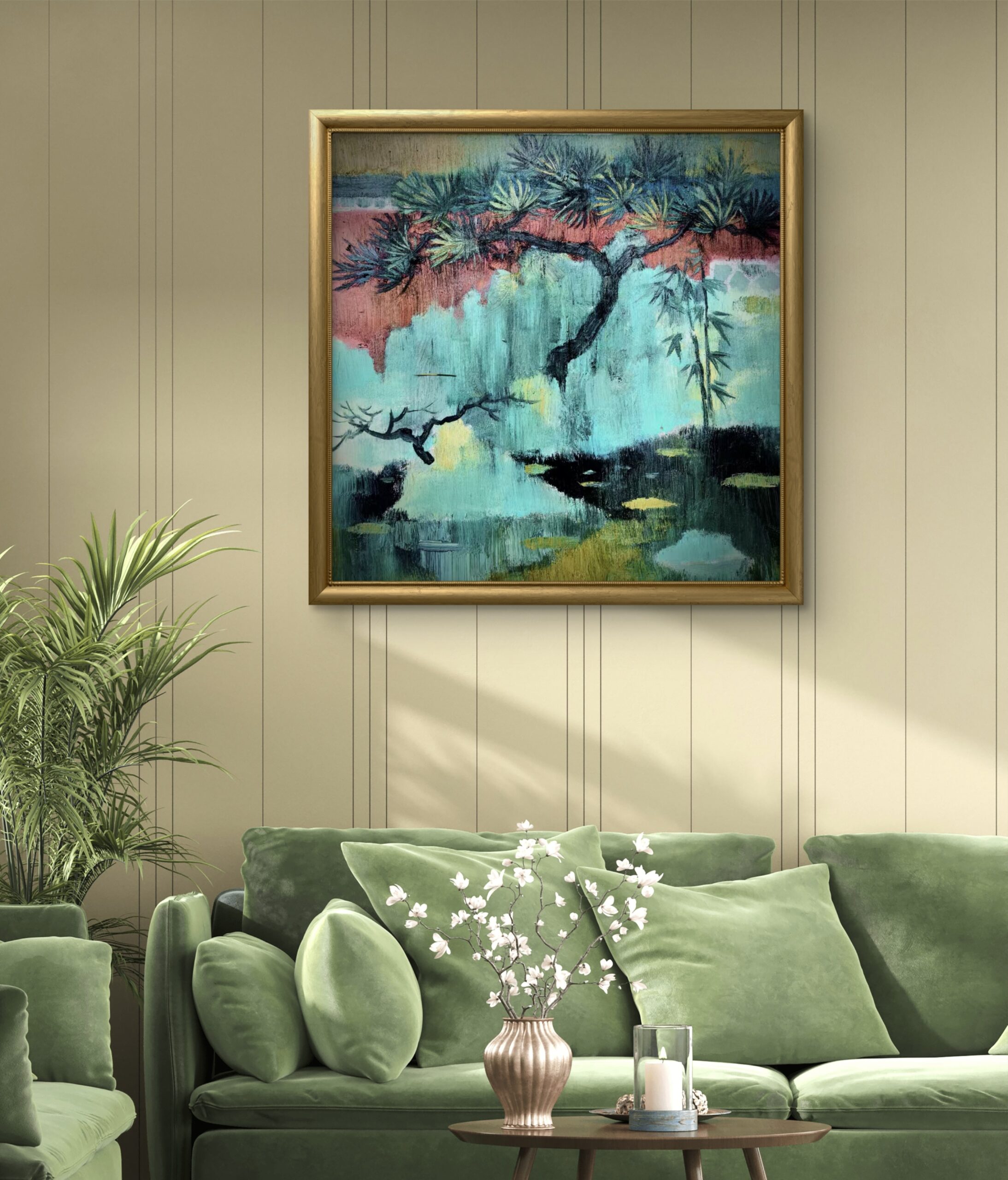 Golden water lilies, applied with a palette knife, are shimmering fragments of memory. A distant bamboo silhouette adds layers and tranquility. This painting is a memory pond on canvas, merging Western texture with Eastern spirit. I hope it invites you to dive into your own summer dream.