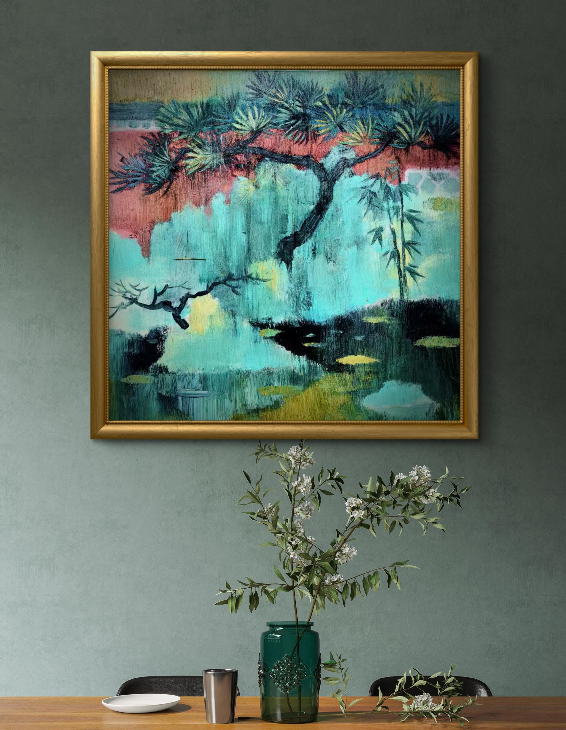 #abstract landscape #expressionistic pond #texture oil painting #turquoise and red #zen garden #meditative and calm # dreamlike scenery